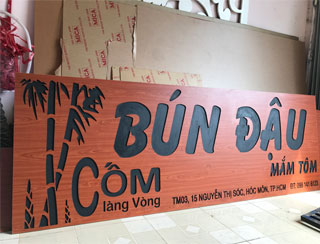 Chúng tôi chọn chất liệu hdf để làm bảng hiệu cho quán ăn, cắt chữ và hình ảnh trên bảng hiệu bằng cnc